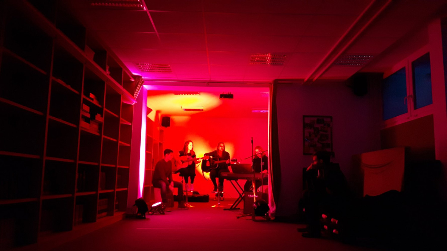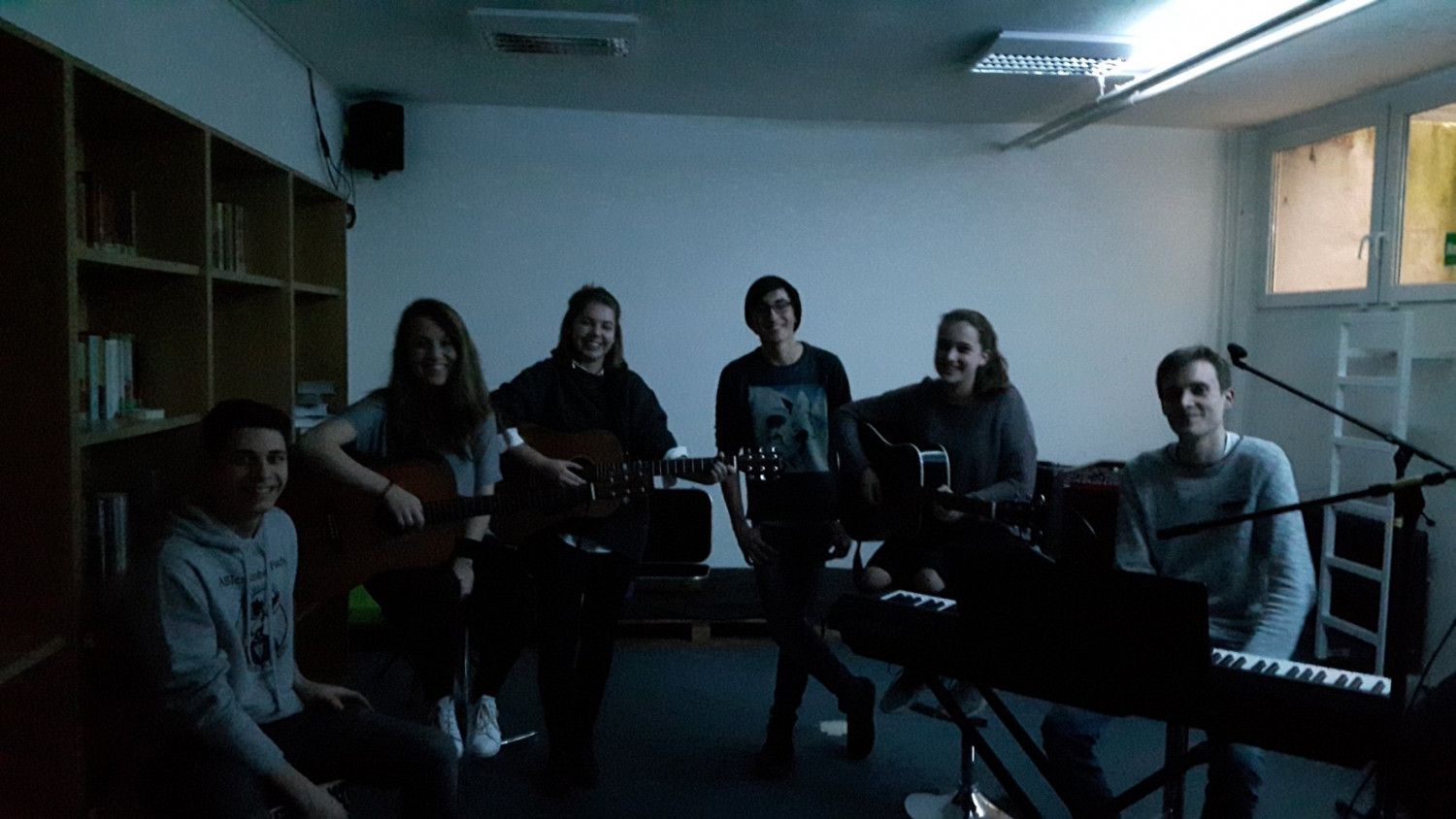 Dann hieß es Werbung schalten, Plakatieren im Schulgebäude, überlegen, an welchen Orten die Plakate am besten gesehen werden. Immerhin war die Organisation des Thekendienstes und des Türstehers durch mein Schülertreff-Team aus der K2 (Valentin und Navid) gesichert. Und dann war da noch die Technik- AG (Lucas, Jasmin und Tim) und die Überlegungen, wie im Schülertreff die Beleuchtung für ein Konzert gemacht werden kann und, ob unplugged gespielt wird, weil sonst vielleicht die Sicherung rausfliegt. Ist sie natürlich nicht- so viel schon mal vorweg.