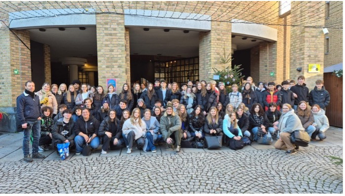 Nach einem erlebnisreichen Wochenende in den Gastfamilien – mit Weihnachtsmarktbesuchen, Backnachmittagen sowie Bowling- und Filmabenden – wurden unsere französischen Gäste am Montagvormittag offiziell in der Schule begrüßt. Frau Bangert hieß sie willkommen, musikalisch unterstützt von Frau Kellerer, Frau Zelle und ihren Achtklässler*innen.