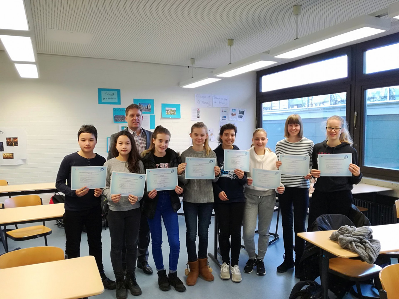 Am letzten Freitag konnte Herr Ackermann zum ersten Mal an unserer Schule erfolgreichen Achtklässlern international anerkannte Sprachdiplome in französischer Sprache aushändigen.