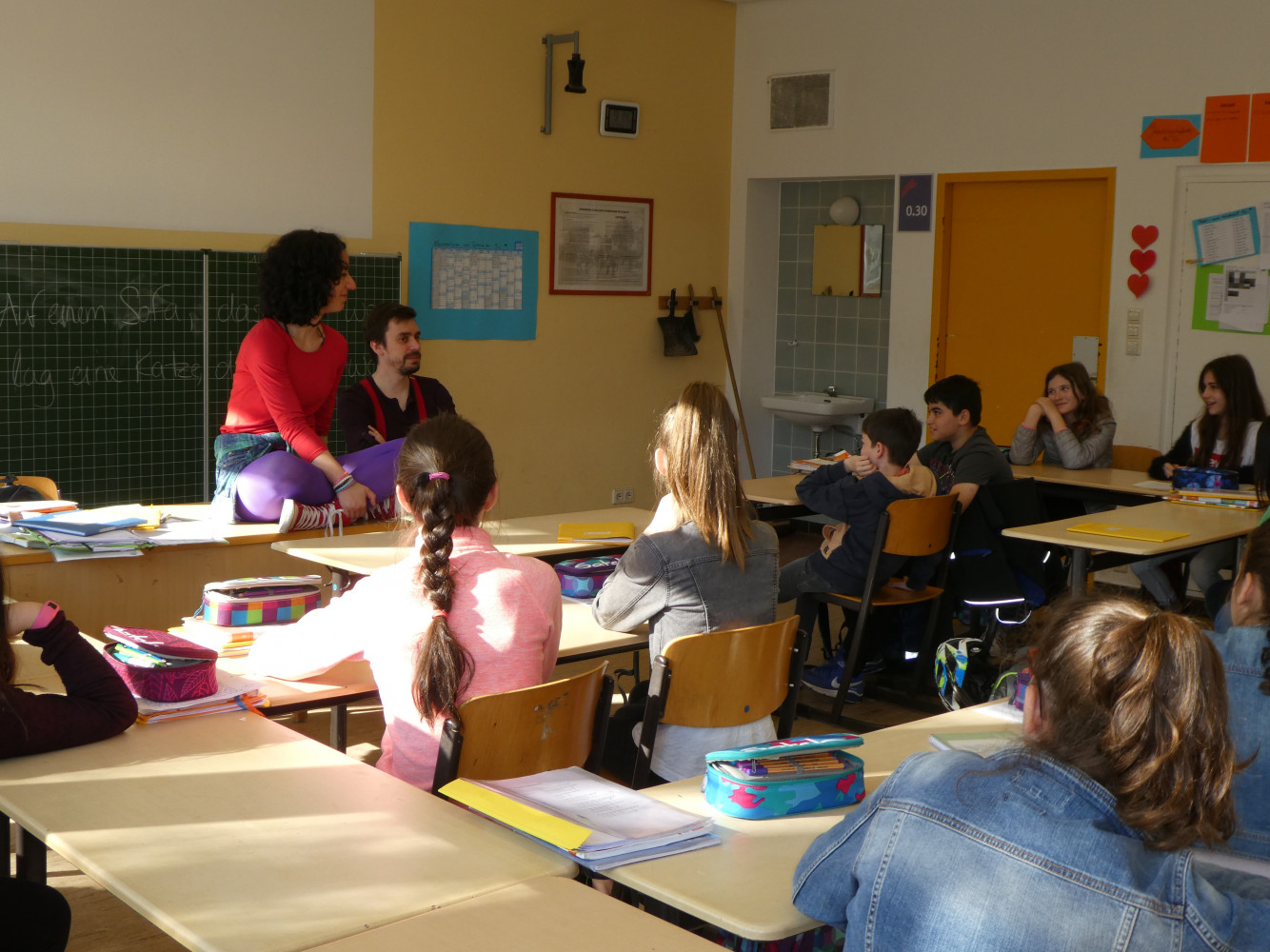 Am Freitag, den 20.04. überraschten zwei Schauspieler des jes-Theaters aus Stuttgart die Klassen 5c und 5d. Während die Regisseurin schon zu Beginn der Stunde, getarnt als Praktikantin, im Klassenzimmer am Unterricht teilnahm, platzten, nach 20 Minuten, ohne Vorankündigung, zwei bunt gekleidete Schauspieler in den Unterricht und begannen, auf, unter, neben..., eben überall, die Klassen in ein Theaterstück zu verwickeln.