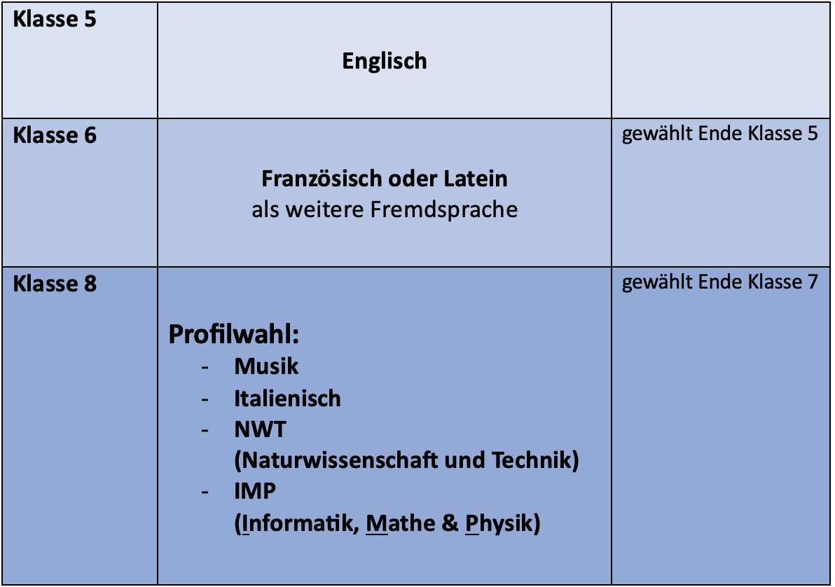 Die Schüler beginnen in Klasse 5 mit der 1. Fremdsprache Englisch, gefolgt von der 2. Fremdsprache Latein oder Französisch in Klasse 6. Ab Klassenstufe 8 beginnt dann eine 3. Fremdsprache (Französisch, Italienisch). (Wahl Ende Klassenstufe 7)