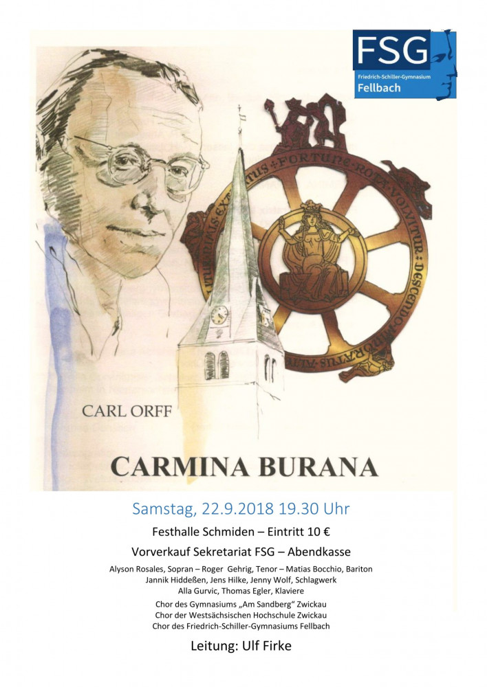 Am Samstag, den 22. September 2018 führt das FSG Carl Orffs „Carmina Burana“ in der Festhalle Schmiden auf. Karten kosten 10 Euro und sind im Sekretariat des FSG sowie an der Abendkasse erhältlich.