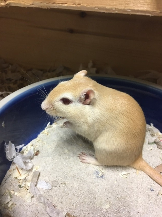 Aktuell haben wir Stabheuschrecken, Mehlwürmer, Mehlkäfer, zwei Achatschnecken (seit November 2019) und drei Wüstenrennmäuse. Die Mäuse sind alle 1,5 Jahre alt, weiblich und heißen Nelly, Krümel und Trixie.