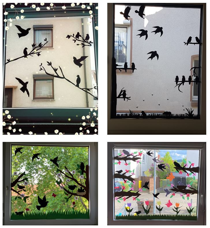 Alle 5. Klässler haben mit großem Aufwand zu Hause Frühlingsfenster mit Vögeln, Blüten und Blumen gestaltet. Die künstlerische Herausforderung, Tiere und Pflanzen nur als Silhouetten darzustellen, haben sie grandios gemeistert. Nun schmücken die Fenster das eigene Zuhause und bringen gleichzeitig Lebensfreude in die Nachbarschaft.