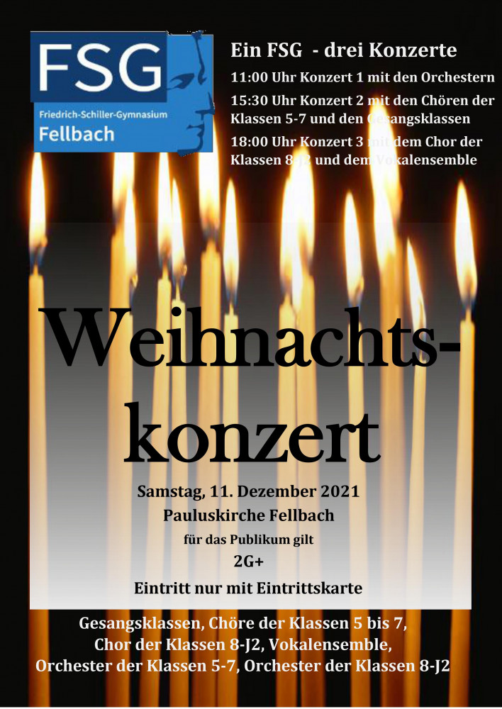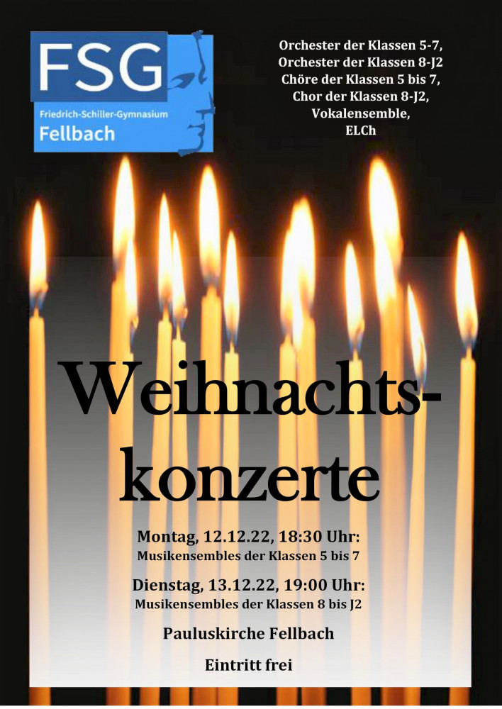 Endlich können wir uns wieder auf das traditionelle Weihnachtskonzert des Friedrich-Schiller-Gymnasiums Fellbach freuen. So wie wir die Weihnachtskonzerte des FSG alle in Erinnerung haben – mit gefüllter Bühne und dicht besetzter Kirche – kann es dieses Jahr natürlich nicht stattfinden. Wir freuen uns jedoch sehr, einen Weg gefunden zu haben, wie wir unsere Tradition trotz hoher Infektionszahlen fortführen und die Ergebnisse der AG-Arbeit der letzten Wochen zur Aufführung bringen können.