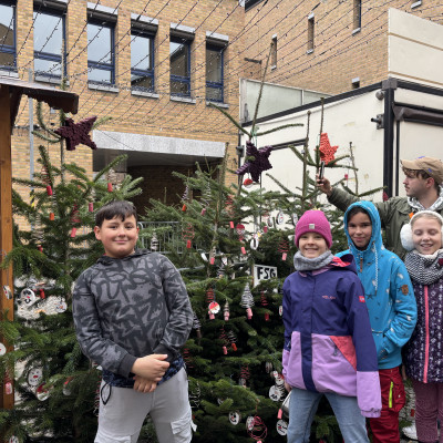 Am Freitag, den 28.11., brachte die Klasse 5b das Entstandene zu den Bäumen und an die Zweige. Nun bringen bunte Zapfen, goldene Sterne und Vieles mehr Farbe und Wärme in die winterliche Jahreszeit.