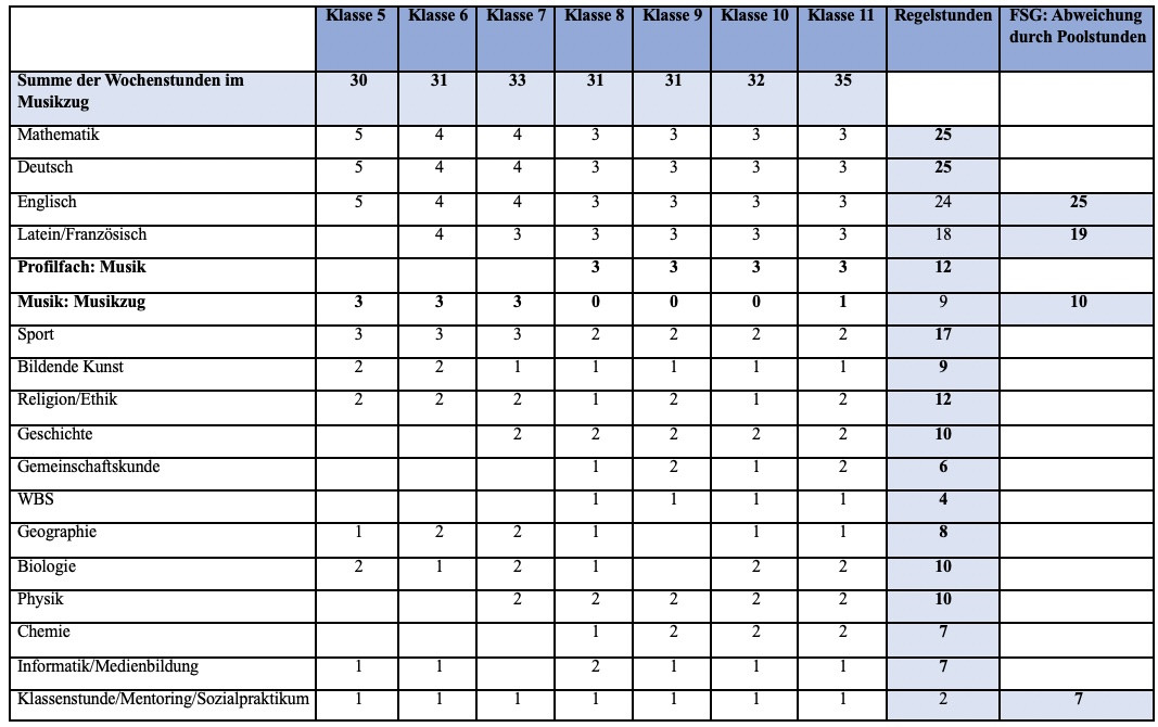 • Musikprofil: In den Klassen 8 bis 10 entfällt der einstündige Musikunterricht, wodurch die Gesamtstundenzahl in diesem Fach eine Stunde unter der der übrigen Klassen liegt. In Klasse 11 wird wieder eine Musikstunde hinzukommen, um die Vorbereitung für das Leistungsfach zu unterstützen.