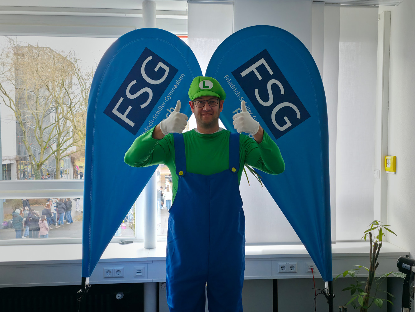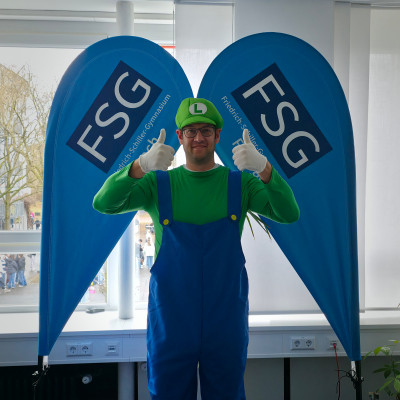 Zum Abschluss zog eine gemeinsame Polonese tanzend über den Schulhof und rundete die Aktion stimmungsvoll ab. Sogar Rektor Herr Brack mischte als Luigi fröhlich mit. Pünktlich zum Beginn der 4. Stunde schwebten alle kostümierten Schüler:innen gut gelaunt zurück in ihre Klassenzimmer.
