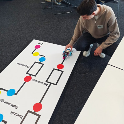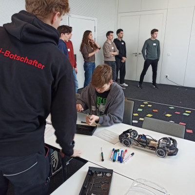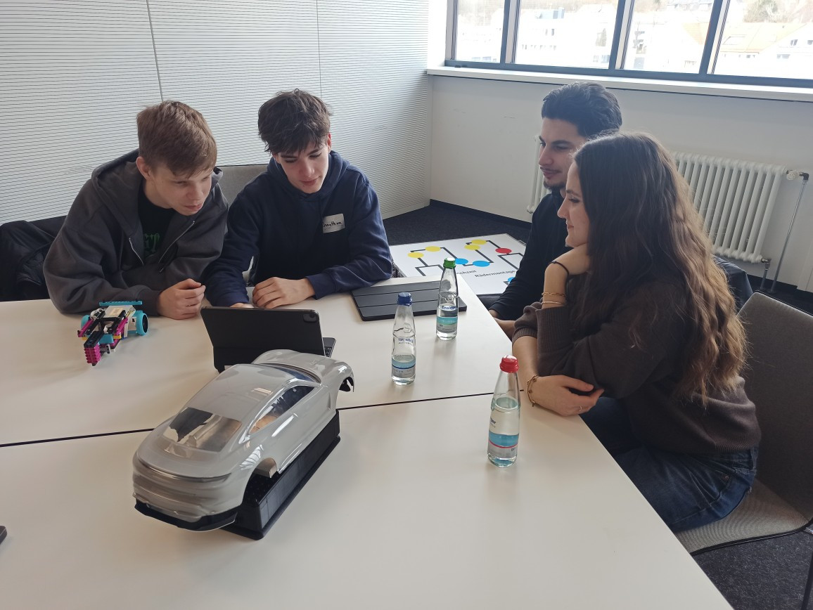 Kaum im Porsche-Ausbildungszentrum in Zuffenhausen angekommen, wurden die Schülerinnen und Schüler nach einem kurzen Einblick in die Agenda des Tages verschiedenen Stationen zugeteilt. Unsere Gruppe arbeitete gemeinsam mit Schülerinnen und Schülern des Gymnasiums in Rutesheim an den Stationen „Coding“, „Agiles Arbeiten“ und „Mechanik“. Ausbildungs- und Studienbotschafter begleiteten die Workshop-Teilnehmenden den ganzen Tag und standen für Fragen sowie Hilfestellungen zur Verfügung. An der Station „Coding“ ging es um die Programmierung eines fahrerlosen Transport-Fahrzeugs mithilfe der Programmiersprache Python. Hier zeigten die Schüler besondere Motivation, auch die kniffligen Zusatzaufgaben innerhalb der vorgegebenen Zeit zu lösen. Kurzerhand lösten sich dazu auch die Gruppenstrukturen kurzzeitig auf, um auch den anderen Teams zu helfen. Für besonderen Spaß sorgten kleine Wettrennen mit den programmierten Modellen. Währenddessen wurden an der Station „Agiles Arbeiten“ Methoden erprobt wurden, um Arbeitsprozesse im Team zu optimieren. In verschiedenen Runden reflektierten die Gruppen ihre Entscheidungen, um in jeder Runde mithilfe von zielgerichteter Kommunikation und dem Überlegen einer gemeinsamen Strategie einen noch besseren Output zu erhalten. Es wurde schnell klar, dass es nicht darum ging, die Aufgabe so zu vereinfachen, um einen Vorteil gegenüber den anderen Gruppen zu erlangen, sondern darum, die Arbeitsabläufe innerhalb des Teams zu verbessern und hierfür die Erfahrungen aller Gruppenmitglieder einzubeziehen. Ihre Fingerfertigkeit konnten die Teilnehmenden wiederum an der „Mechanik“-Station erproben, an der die Montage der Vorderachse des Taycans im Modell im Mittelpunkt stand. Dass neben der ganzen Arbeit auch der Spaß nicht zu kurz kam, war allen Teilnehmenden deutlich anzumerken.