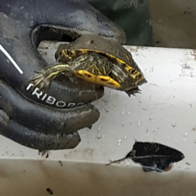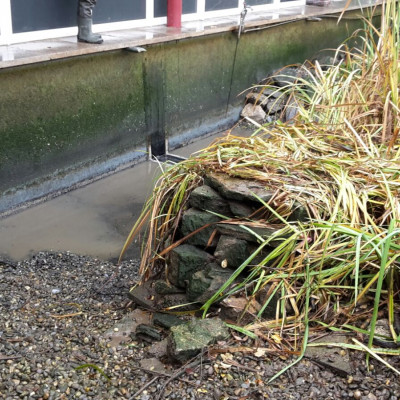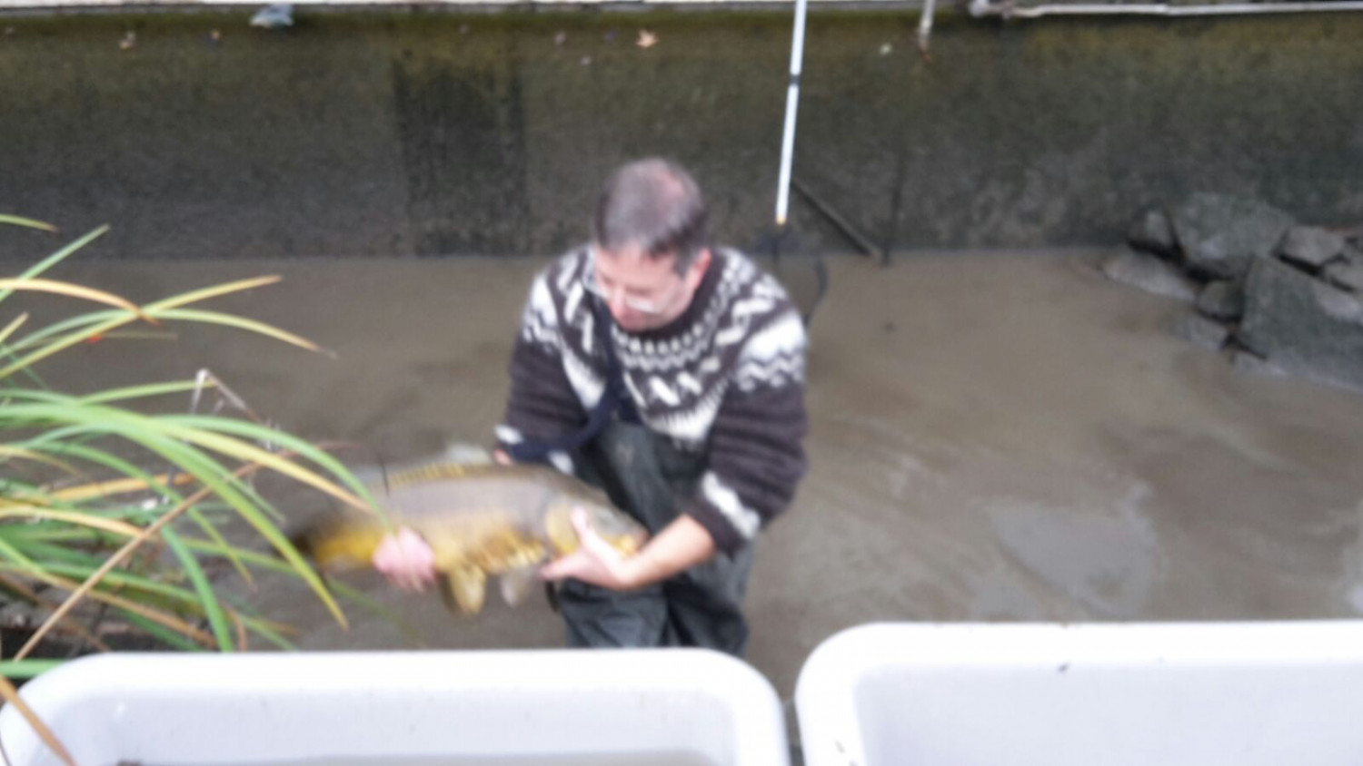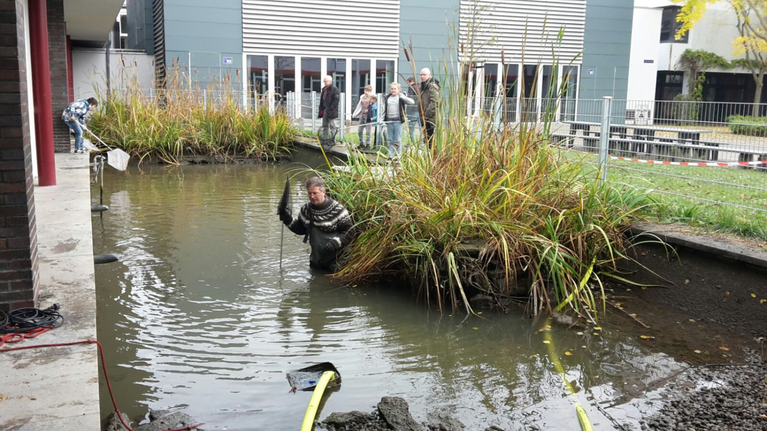 Der Schulteich auf dem Schulhof des FSG wurde gereinigt. Dazu wurde das Wasser abgelassen bzw. abgepumpt, die Fische, Frösche und Schildkröten wurden herausgefangen und in Wasserbehältern aufbewahrt, bis der Teich wieder gefüllt werden konnte.