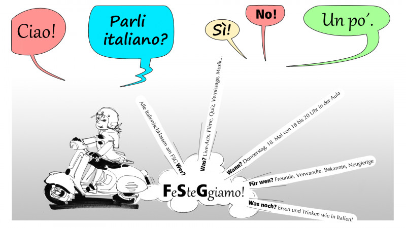 Die Italienischklassen laden ein zu einem großen Fest am Donnerstag, den 18. Mai ab 18 Uhr in der Aula. Es gibt Live-Acts, Filme, Vernissagen, ein großes Italien-Quiz (mit Preisen), Musik und italienische Leckereien.