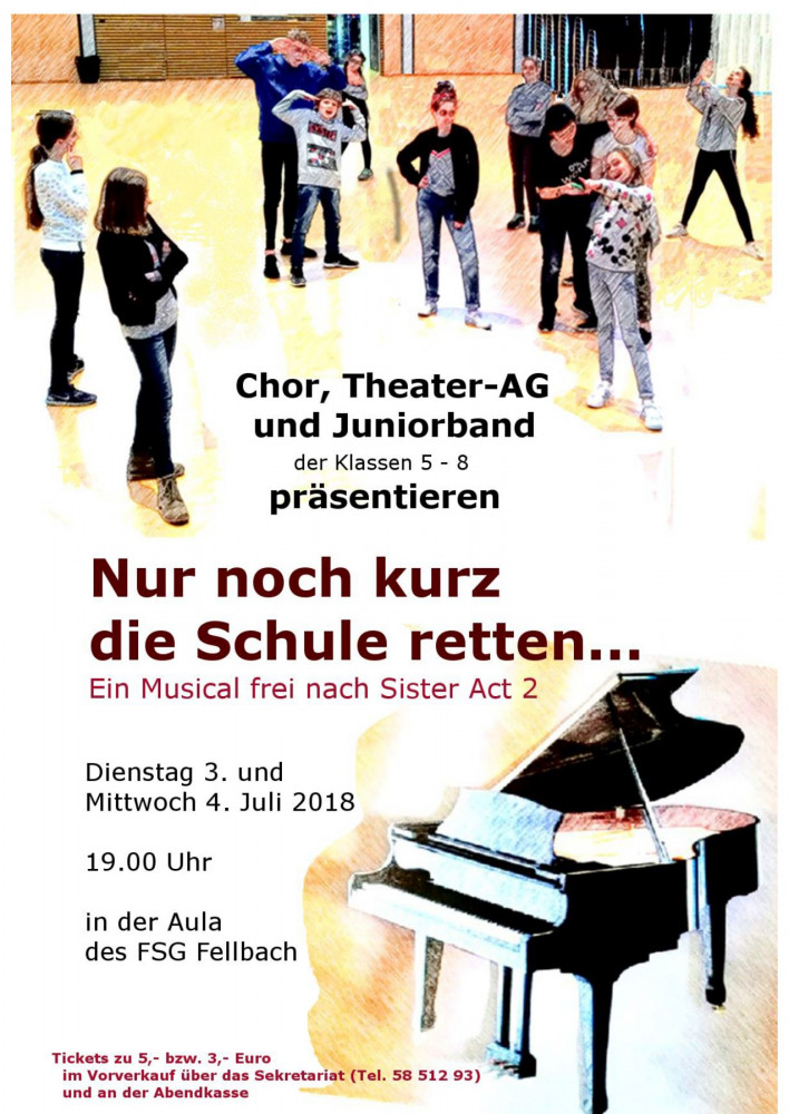 Keine Sorge: Nicht das FSG ist bedroht. Im Musical geht es um eine Schule in San Francisco. Sie wollen wissen, warum diese Schule gerettet werden muss und wie das geschehen soll? Am 3. und 4. Juli wird die ganze Geschichte in der Aula im FSG erzählt.