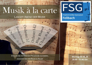 Am Montag, den 3. Juni 2019, wird im Friedrich-Schiller-Gymnasium ein vielfältiges und reichhaltiges musikalisches Menü serviert: Von 18 bis 21 Uhr laden fast 200 musizierende Schülerinnen und Schüler zum jährlichen Wandelkonzert ins FSG ein. Die Besucher können von Raum zu Raum wandeln und sich ihr musikalisches Programm ganz nach ihrem Geschmack zusammenstellen. Auf der Speisekarte stehen alle Chöre, Orchester und Bands der Musikprofilschule.