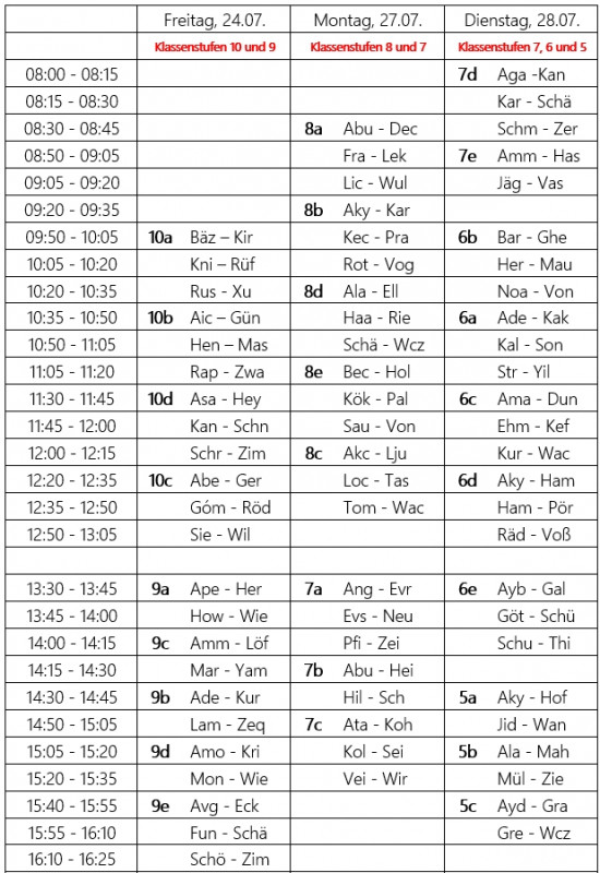 - Um dies einzuhalten, treffen sich alle 15 Minuten 10-15 Schüler (s. Bücherrückgabe Klassenstufen 5-10 - Zeitplan) in der Cafeteria (neben dem rechten Eingang zur Aula; Mindestabstand einhalten!).