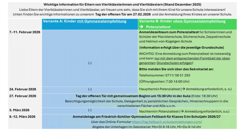 • Blatt 1-3 der Grundschulempfehlung, insbesondere die Empfehlung für das Gymnasium ODER das Formblatt über den bestandenen Potenzialtest (ohne entsprechende Gymnasialeignung ist keine Aufnahme am FSG möglich)