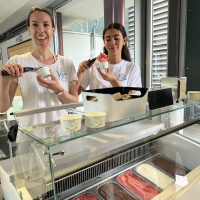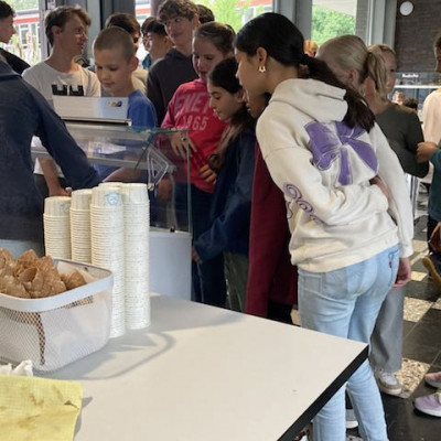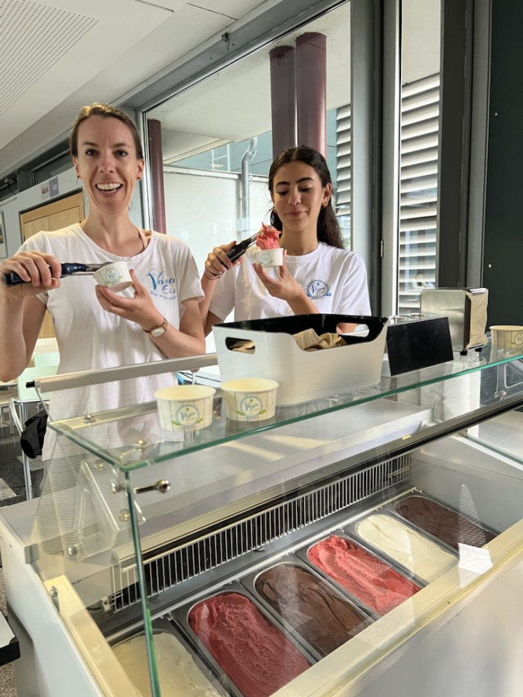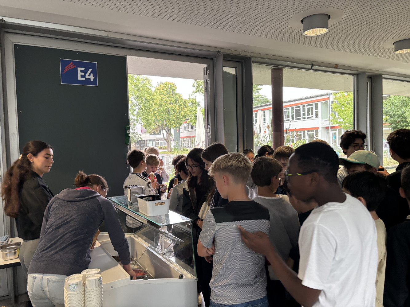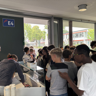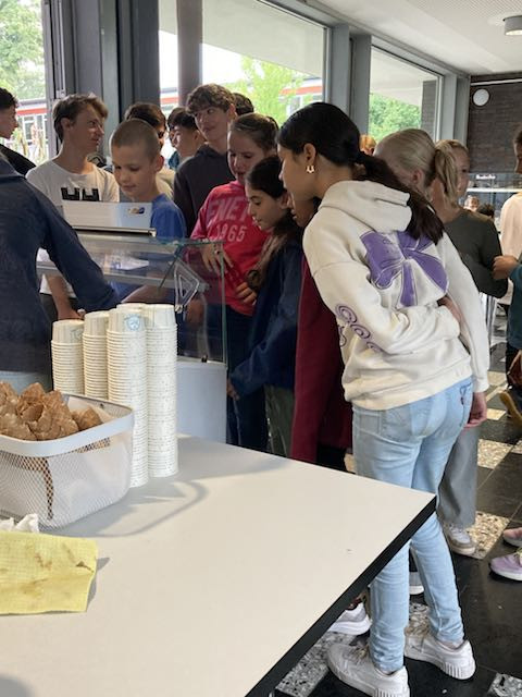 Obwohl das Wetter am heutigen Tag nicht ganz mitspielte, tat das der Stimmung keinen Abbruch. Der Elternbeirat hatte zur Feier des Schuljahres eine besondere Überraschung vorbereitet: 700 Portionen Eis der Fellbacher Eisdiele Vana wurden bereitgestellt. Wegen des regnerischen Wetters fand die Verteilung jedoch nicht wie geplant im Freien, sondern in der Mensa statt. Dort konnten sich alle Schüler*innen, Lehrkräfte sowie die städtischen Angestellten zwischen Zitrone, Schokolade und Erdbeere entscheiden – eine süße Belohnung zum Abschluss.