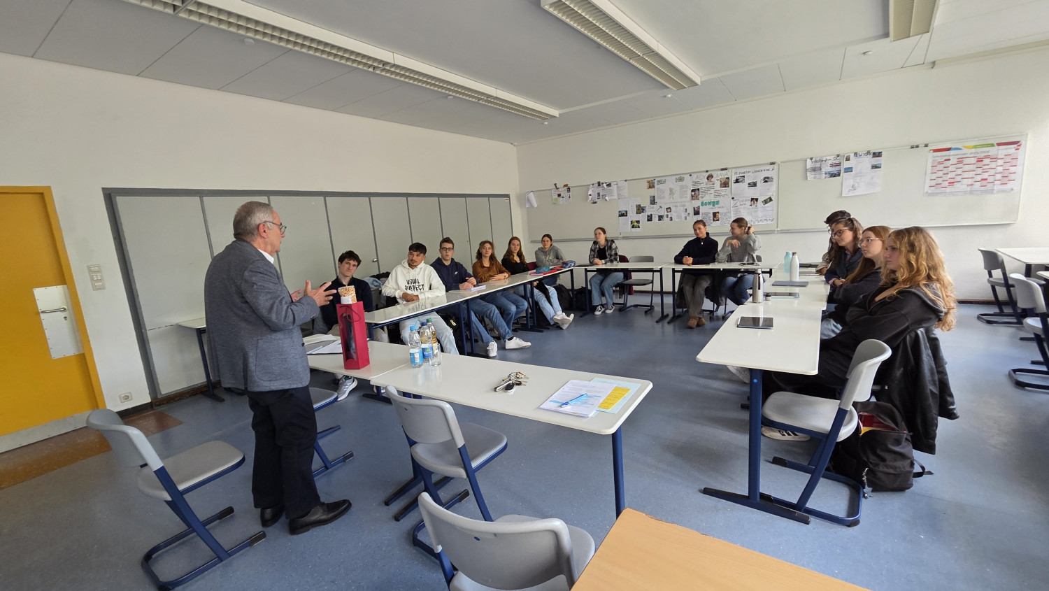 Im Geschichtsunterricht der Oberstufe befasst man sich tiefgründig mit der Rolle der Demokratie, ihr entgegenstehende Systeme und dem jeweiligen Einfluss auf den Lauf der Geschichte. Dabei fielen uns immer wieder Parallelen zur Gegenwart auf. So scheint die Demokratie in vielen „westlichen“ Nationen heute, wie schon vor rund hundert Jahren, „unter Beschuss“ oder zumindest unter Druck zu sein. Antidemokratische bis hin zu autokratische Strömungen versuchen, ihr System zu etablieren und die Öffentlichkeit wird oft mit Fehlinformationen geflutet, während Demokraten die Errungenschaften des letzten Jahrhunderts mühsam schützen wollen. Vor diesem Hintergrund sammelten sich während unseres Unterrichts viele Fragen an, die wir nun dem Experten stellen konnten.