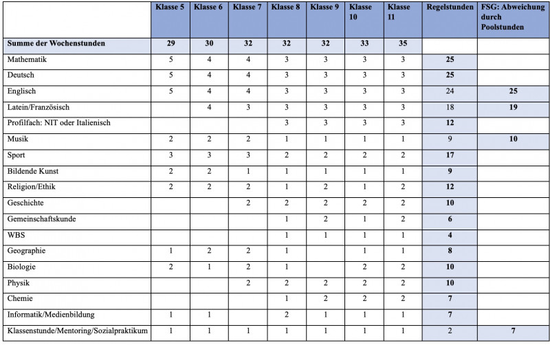 Musikprofil: In den Klassen 8 bis 10 entfällt der einstündige Musikunterricht, wodurch die Gesamtstundenzahl in diesem Fach eine Stunde unter der der übrigen Klassen liegt. In Klasse 11 wird wieder eine Musikstunde hinzukommen, um die Vorbereitung für das Leistungsfach zu unterstützen.