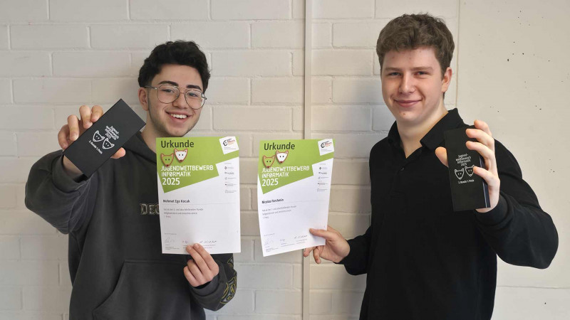 Unsere Schüler Nicolas Farchmin und Mehmet Kocak haben beim bundesweiten Jugendwettbewerb Informatik einen herausragenden Erfolg erzielt: Beide wurden als 1. Preisträger ausgezeichnet. In drei anspruchsvollen Wettbewerbsrunden stellten sie ihr Können in den Bereichen Programmierung, logisches Denken und Problemlösen unter Beweis. Als Anerkennung erhielten die beiden jeweils eine Powerbank als Preis. Wir gratulieren herzlich zu diesem tollen Erfolg und sind stolz auf diese besondere Leistung im Bereich Informatik! Macht weiter so!