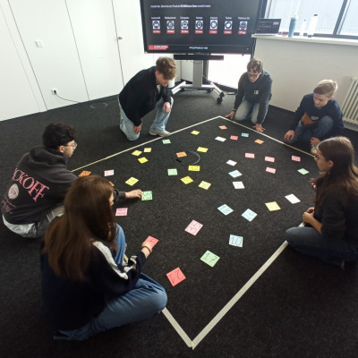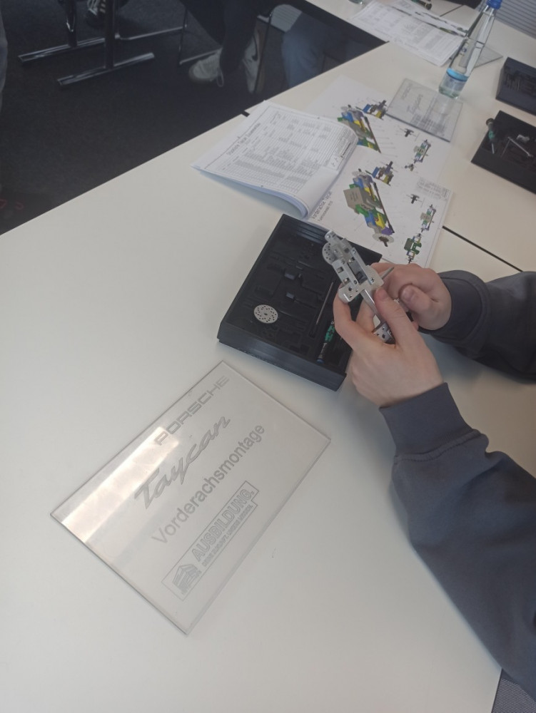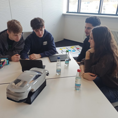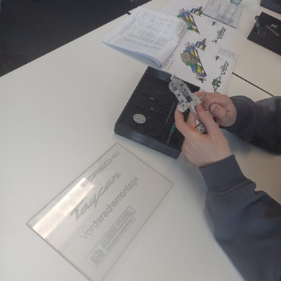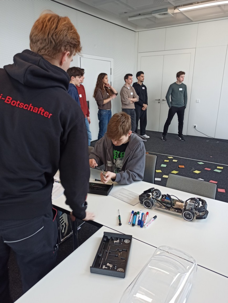 Kaum im Porsche-Ausbildungszentrum in Zuffenhausen angekommen, wurden die Schülerinnen und Schüler nach einem kurzen Einblick in die Agenda des Tages verschiedenen Stationen zugeteilt. Unsere Gruppe arbeitete gemeinsam mit Schülerinnen und Schülern des Gymnasiums in Rutesheim an den Stationen „Coding“, „Agiles Arbeiten“ und „Mechanik“. Ausbildungs- und Studienbotschafter begleiteten die Workshop-Teilnehmenden den ganzen Tag und standen für Fragen sowie Hilfestellungen zur Verfügung. An der Station „Coding“ ging es um die Programmierung eines fahrerlosen Transport-Fahrzeugs mithilfe der Programmiersprache Python. Hier zeigten die Schüler besondere Motivation, auch die kniffligen Zusatzaufgaben innerhalb der vorgegebenen Zeit zu lösen. Kurzerhand lösten sich dazu auch die Gruppenstrukturen kurzzeitig auf, um auch den anderen Teams zu helfen. Für besonderen Spaß sorgten kleine Wettrennen mit den programmierten Modellen. Währenddessen wurden an der Station „Agiles Arbeiten“ Methoden erprobt wurden, um Arbeitsprozesse im Team zu optimieren. In verschiedenen Runden reflektierten die Gruppen ihre Entscheidungen, um in jeder Runde mithilfe von zielgerichteter Kommunikation und dem Überlegen einer gemeinsamen Strategie einen noch besseren Output zu erhalten. Es wurde schnell klar, dass es nicht darum ging, die Aufgabe so zu vereinfachen, um einen Vorteil gegenüber den anderen Gruppen zu erlangen, sondern darum, die Arbeitsabläufe innerhalb des Teams zu verbessern und hierfür die Erfahrungen aller Gruppenmitglieder einzubeziehen. Ihre Fingerfertigkeit konnten die Teilnehmenden wiederum an der „Mechanik“-Station erproben, an der die Montage der Vorderachse des Taycans im Modell im Mittelpunkt stand. Dass neben der ganzen Arbeit auch der Spaß nicht zu kurz kam, war allen Teilnehmenden deutlich anzumerken.