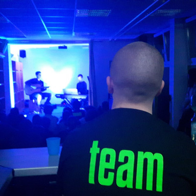 Dann hieß es Werbung schalten, Plakatieren im Schulgebäude, überlegen, an welchen Orten die Plakate am besten gesehen werden. Immerhin war die Organisation des Thekendienstes und des Türstehers durch mein Schülertreff-Team aus der K2 (Valentin und Navid) gesichert. Und dann war da noch die Technik- AG (Lucas, Jasmin und Tim) und die Überlegungen, wie im Schülertreff die Beleuchtung für ein Konzert gemacht werden kann und, ob unplugged gespielt wird, weil sonst vielleicht die Sicherung rausfliegt. Ist sie natürlich nicht- so viel schon mal vorweg.