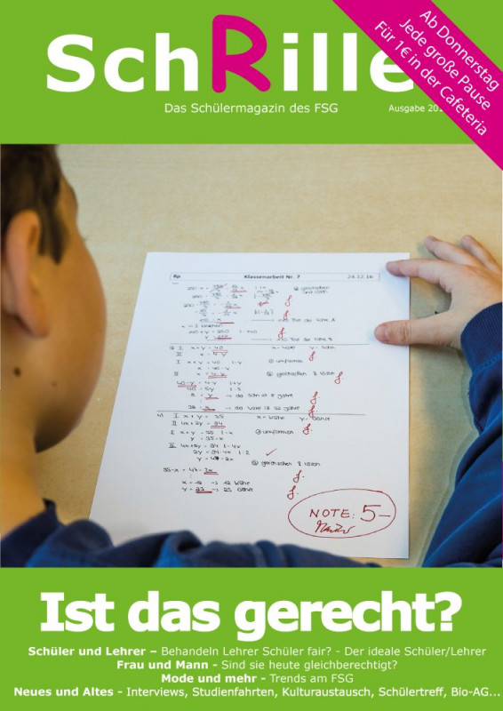 Das Schülermagazin des FSG Die neue Ausgabe des Schülermagazins des FSG könnt ihr ab Donnerstag jede große Pause in der Cafeteria kaufen. Titel: Ist das gerecht? News-Archiv 2016/17 2017/18 2019/20 2020/21 Kunstwerk des Monats Kunstwerk des Monats Oktober: "Winterlandschaft" (Acrylmalerei) von Maia Frech (J2, 2-stündig) Schülerzeitung Schule BW Die nächsten Ferien 27.10.2025 - 31.10.2025 Herbstferien22.12.2025 - 06.01.2026 Weihnachtsferien Ferienpläne anschauen Aktuelles vom Elternbeirat Informationen vom Elternbeirat für Schüler und Eltern