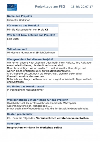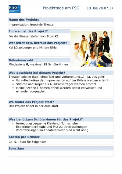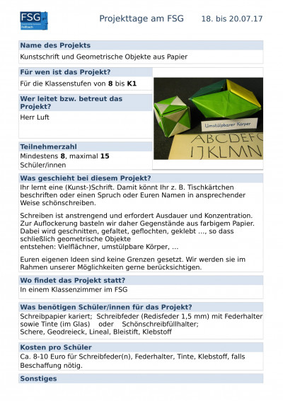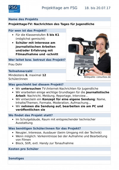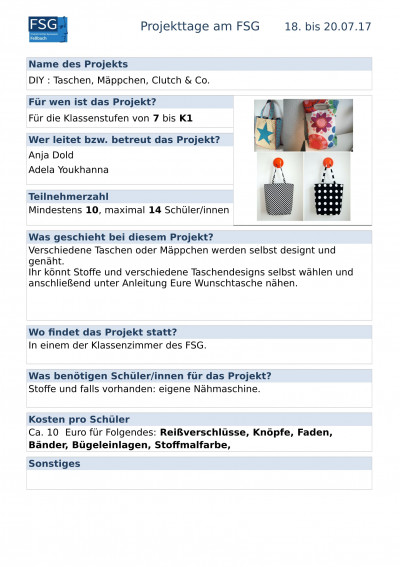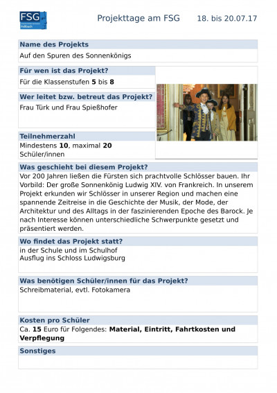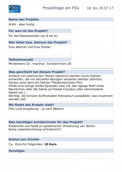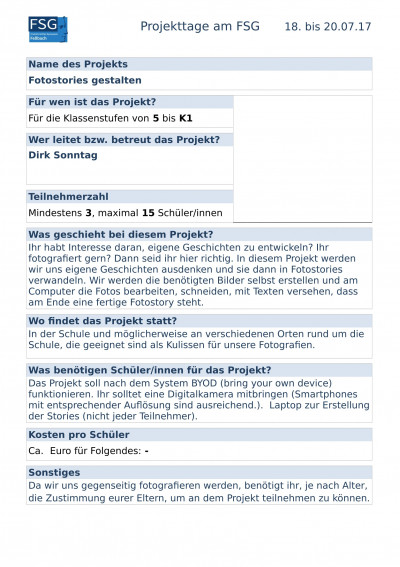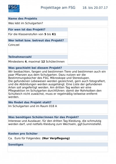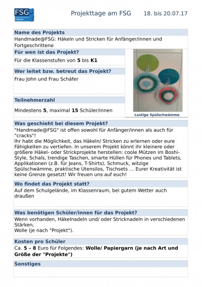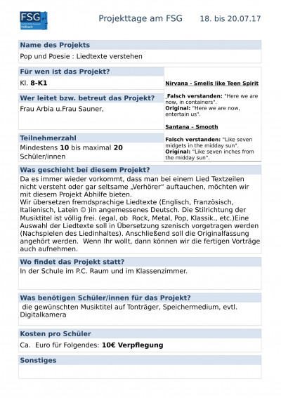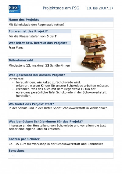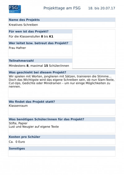Vom 18.07. bis 20.07.2017 finden am FSG Projekttage statt. Projekttage ermöglichen Schülerinnen und Schülern, sich über mehrere Tage hinweg mit einem selbst gewählten Thema zu beschäftigen und Inhalte auch einmal jahrgangs- und fächerübergreifend zu erkunden.