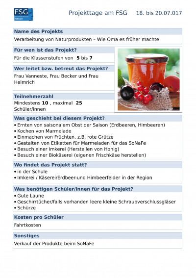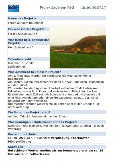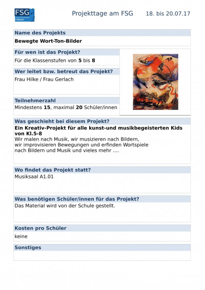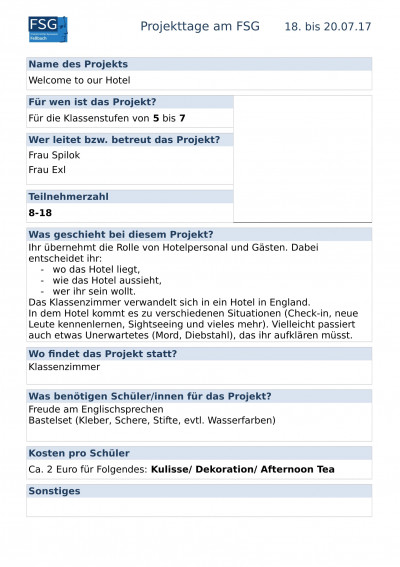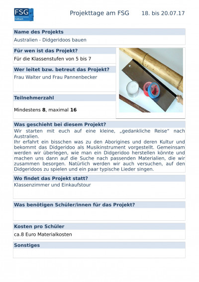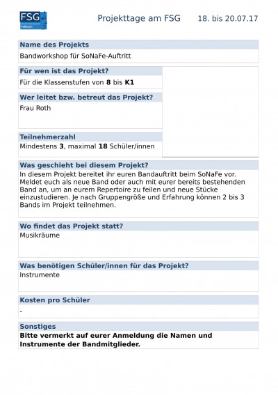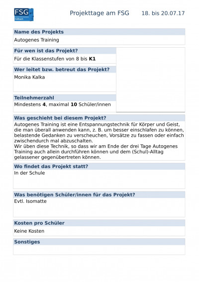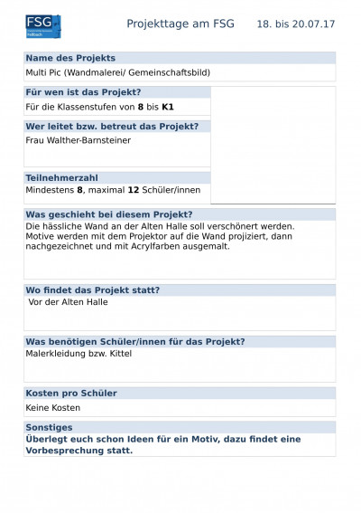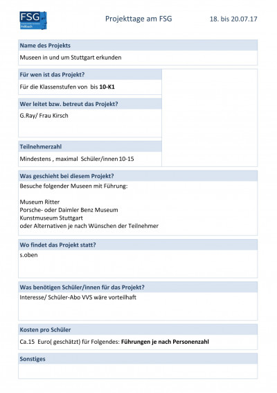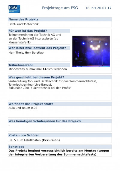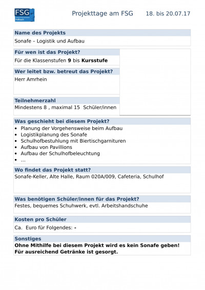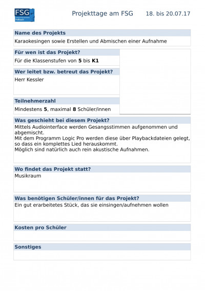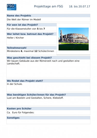 Vom 18.07. bis 20.07.2017 finden am FSG Projekttage statt. Projekttage ermöglichen Schülerinnen und Schülern, sich über mehrere Tage hinweg mit einem selbst gewählten Thema zu beschäftigen und Inhalte auch einmal jahrgangs- und fächerübergreifend zu erkunden.