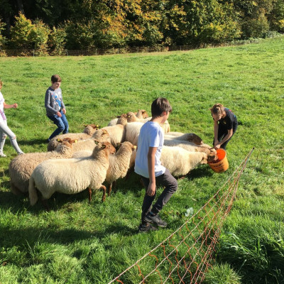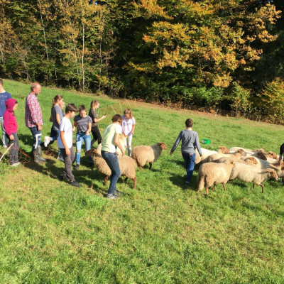 Nach der Hofführung, in der Mutterkuhhaltung und Biolandwirtschaft auf dem Programm standen, kam das Highlight des Tages: Die Fütterung der Schafe. Das war eine große Gaudi, denn die Schafe rannten dem orangefarbenen Eimer hinterher, immer in der Hoffnung, noch ein bisschen altes Brot zu erwischen. So tobten am Ende alle – Schülerinnen und Schüler und Schafe – mit einem Eimer über die Wiese und waren – natürlich – glücklich.