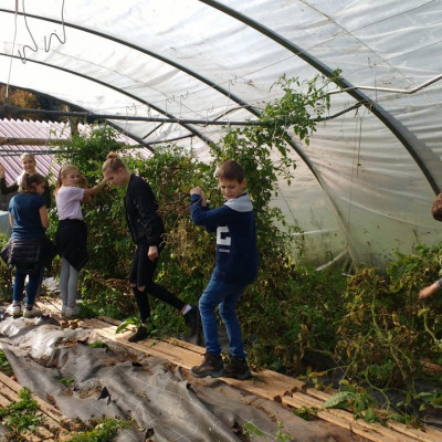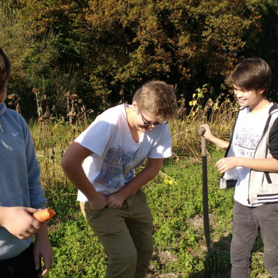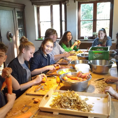 Nach der Zugfahrt und einer kleinen Wanderung durch den Wald begann kurz nach der Ankunft auf dem Biolandhof Wacholderhof die Arbeit. Eine Gruppe kümmerte sich um das Waschen und Schnippeln des Gemüses und des Obstes fürs Mittagessen, eine Gruppe half bei der Karottenernte und die dritte Gruppe erntete Tomaten und räumte anschließend das ganze Tomatengewächshaus aus. Die Arbeit brachte allen Spaß, aber auch Hunger, so dass sich alle über das leckere Essen hermachten. Trotz anfänglicher Angst, dass es nicht reichen würde, wurden alle mehr als satt, spätestens nach dem Nachtisch.