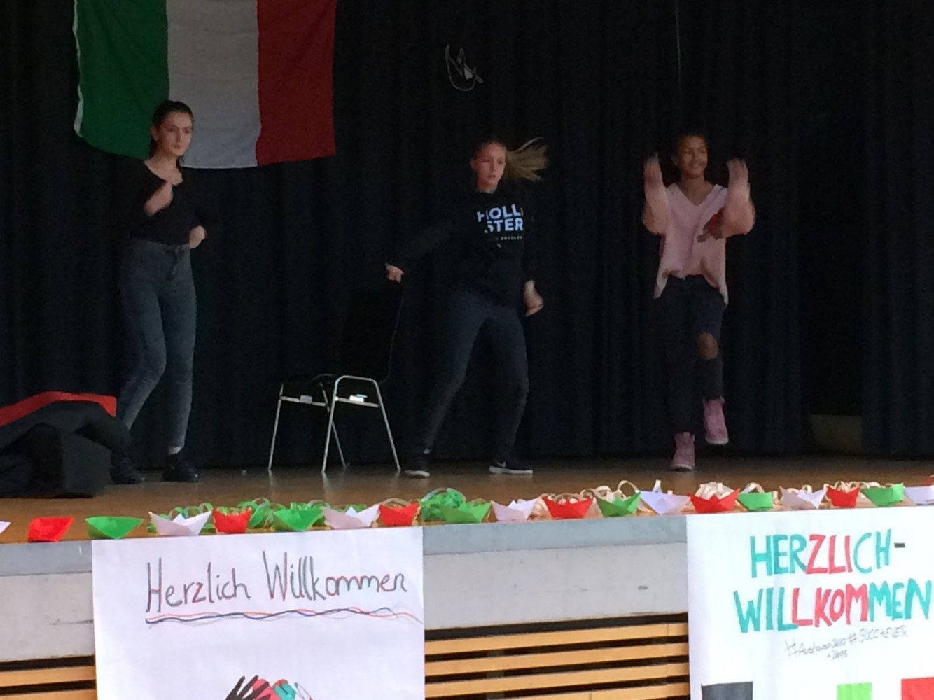 - Singen: Am Dienstag, den 12. Dezember, sind die italienischen Gastschüler müde und verspätet angekommen. Wir haben ihnen einen rauschenden Empfang bereitet mit Gesang, Plakaten und herzlichen Umarmungen.