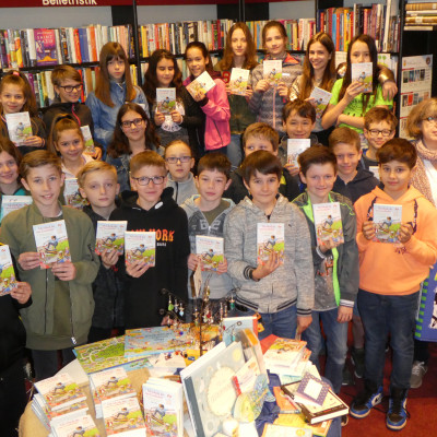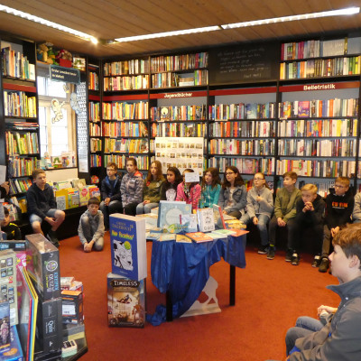 Wusstet ihr, dass Bücher überall gleich viel kosten? Wir, die Klassen 5a und 5c haben gelernt, dass das an der Buchpreisbindung liegt, die es in Deutschland gibt. Außerdem kann man Bücher ganz unterschiedlich binden und viele Buchhandlungen haben zu neuen Büchern kleine Leseproben, die man sich kostenlos mitnehmen darf. Die Buchhandlung in Fellbach hat immer 10.-15.000 Bücher vorrätig, auch wenn wir schon viel über Bücher wussten, das hätten wir nicht gedacht. Für Nachschub ist also gesorgt, das Buchgeschenk  hatten einige nämlich schon am nächsten Tag fertig gelesen.