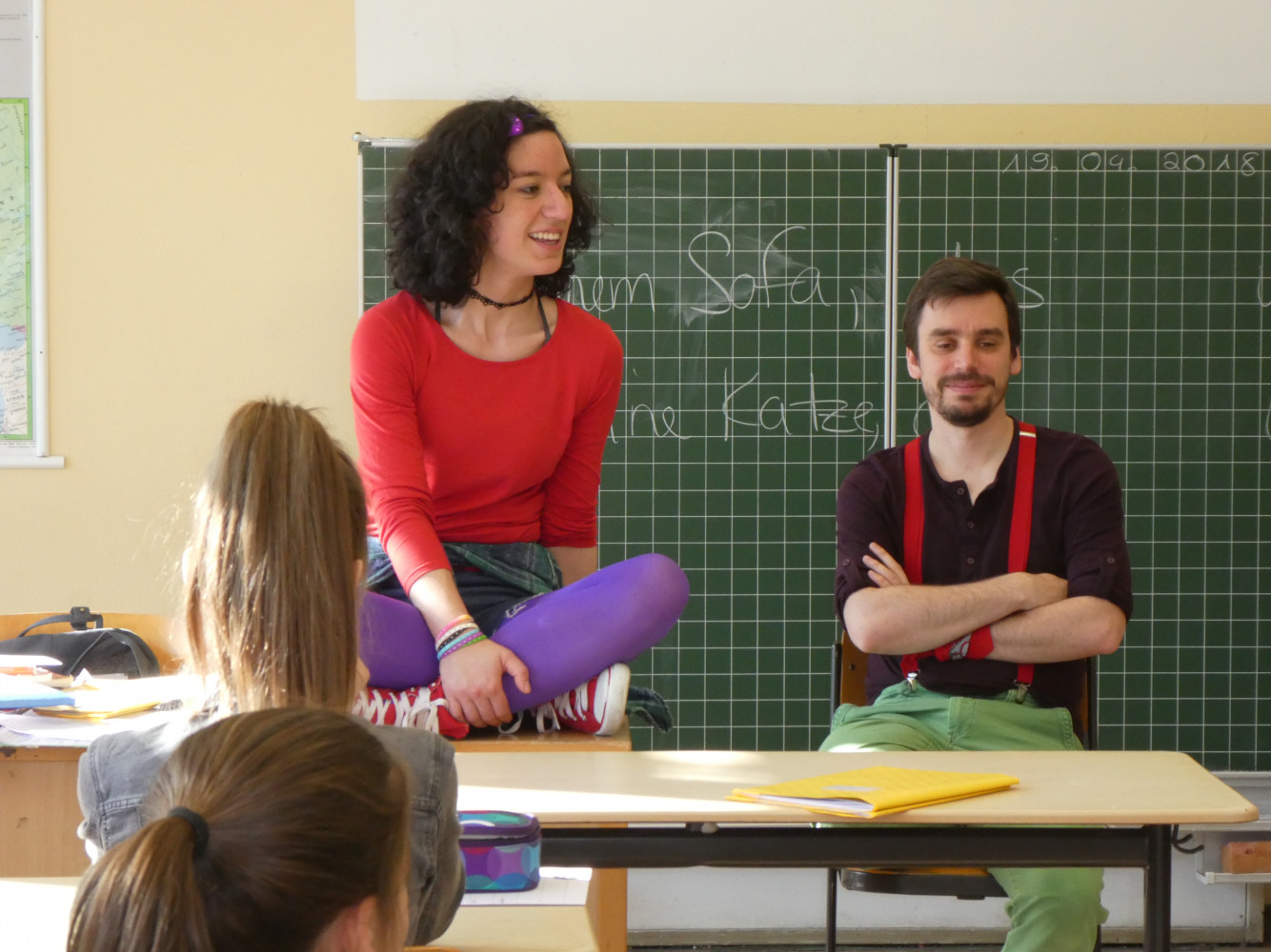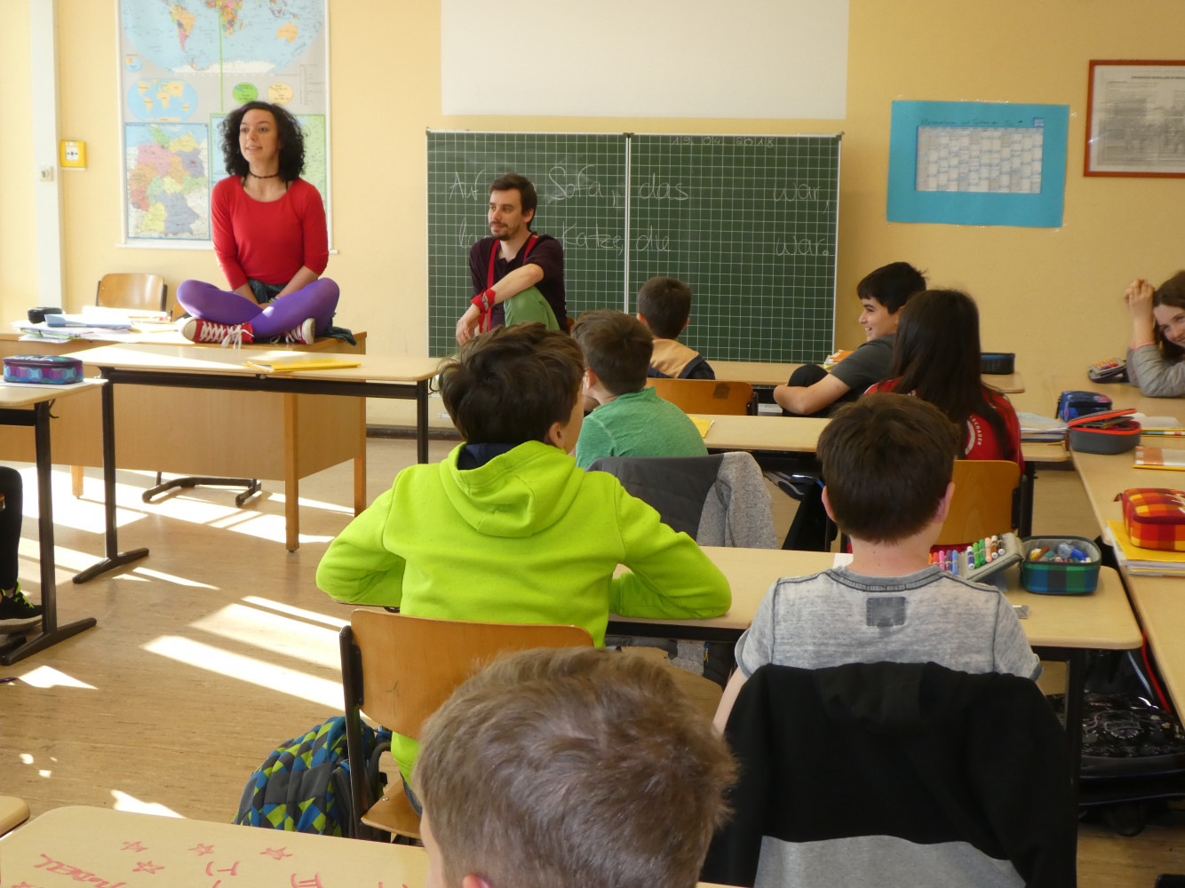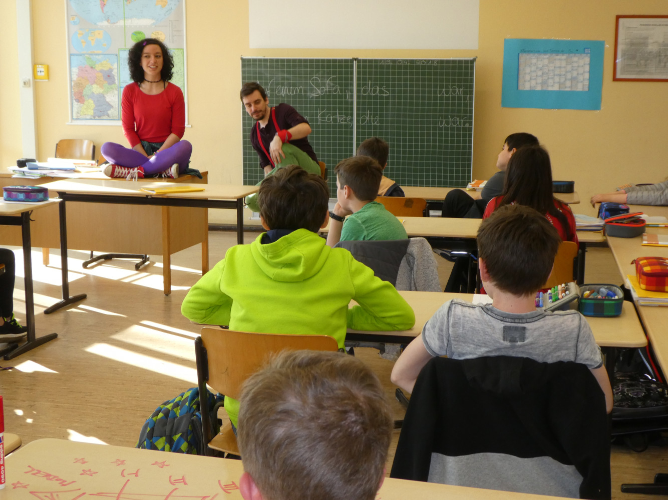 Am Freitag, den 20.04. überraschten zwei Schauspieler des jes-Theaters aus Stuttgart die Klassen 5c und 5d. Während die Regisseurin schon zu Beginn der Stunde, getarnt als Praktikantin, im Klassenzimmer am Unterricht teilnahm, platzten, nach 20 Minuten, ohne Vorankündigung, zwei bunt gekleidete Schauspieler in den Unterricht und begannen, auf, unter, neben..., eben überall, die Klassen in ein Theaterstück zu verwickeln.