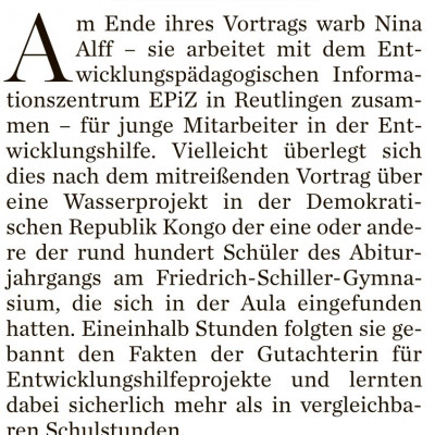 Nina Alff war bei uns in ihrer Funktion als Referentin des EpiZ Reutlingen. Das Entwicklungspädagogische Informationszentrum Reutlingen hat das Programm „Bildung trifft Entwicklung“, das zurückgekehrte Fachkräfte aus der Entwicklungszusammenarbeit zu Bildungsveranstaltungen in Schulen vermittelt.