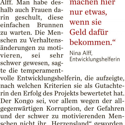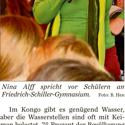 Frau Dr. Christina Alff arbeitet seit 2013 als Bildungsreferentin bei Oikocredit* und ist in vielen Auslandseinsätzen unter anderem in Afghanistan, Pakistan und vielen Ländern West-Afrikas gewesen. Unter anderem hat sie dabei Wasserprojekte begutachtet, betreut und aufgebaut. Einer ihrer anstrengendsten Einsätze war dabei in der Demokratischen Republik Kongo, einem Land, dass eigentlich Wasser und Rohstoffe im Überfluss hat und trotzdem zu den Ärmsten der Welt zählt. Ihre lebhaften Erzählungen und Erklärungen zu den Lebensumständen und den Möglichkeiten und Grenzen der Entwicklungsarbeit waren, wie die Beteiligung des Publikums zeigte, spannend und hochaktuell.