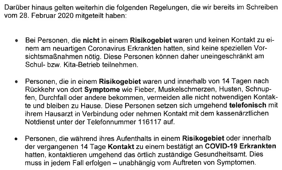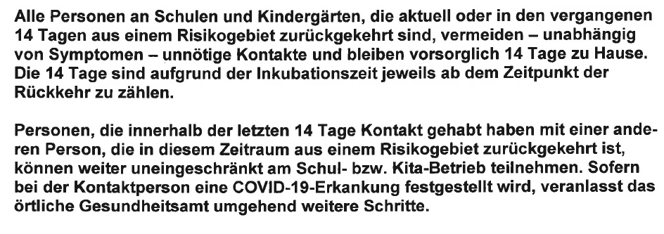 bitte beachten Sie die Ausweitung der Gefährdungsgebiete auf die Region Südtirol. Sollte Ihr Kind in den letzten 14 Tagen dort gewesen sein, folgen Sie bitte dem Schema der Gesundheitsämter – dort erhalten Sie weitere Verhaltenshinweise für den jeweiligen Einzelfall. Vor endgültiger Prüfung muss ihr Kind zu Hause bleiben.