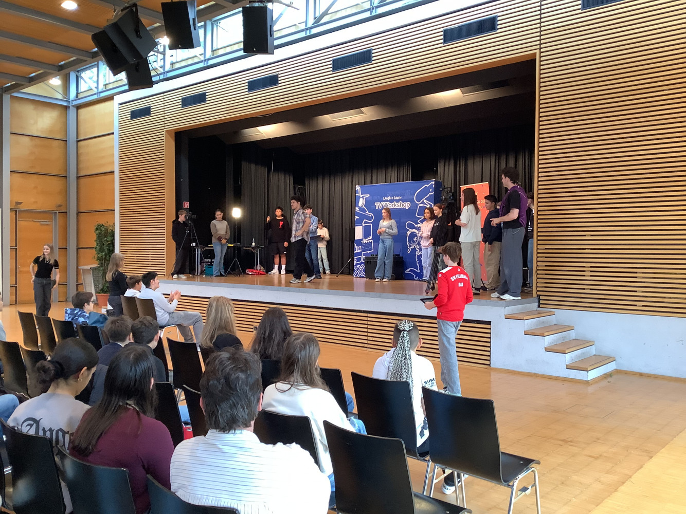 Kameras, Scheinwerfer, Regieanweisungen – und mittendrin unsere Schülerinnen und Schüler: Am Freitag, den 10. Oktober 2025, verwandelte sich die Aula des Friedrich-Schiller-Gymnasiums Fellbach in ein echtes Fernsehstudio. Zu Gast war Laugh n Learn mit dem „Behind the Scenes“ TV Workshop, konzipiert vom Schauspieler und Produzenten Joe Chambers, bekannt aus BBC-Produktionen.